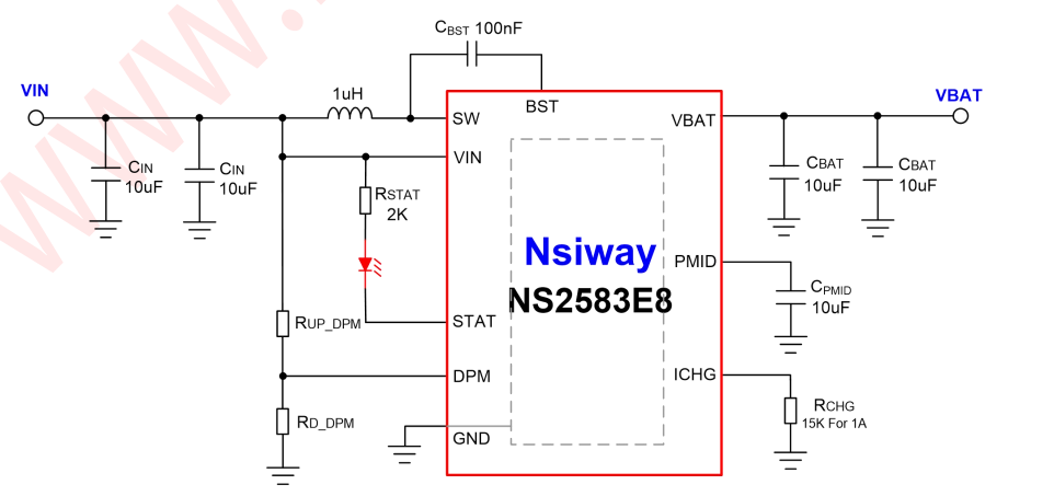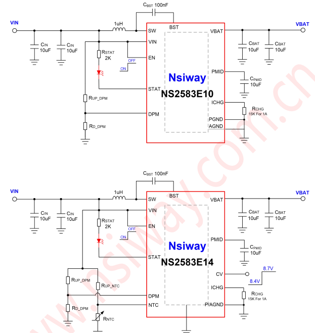 NS2583 芯片內(nèi)置輸入適配器電流限制的 DPM 功能??赏ㄟ^(guò)外置分壓電阻設(shè)置不同的 DPM 電壓,以匹配不同適配器的輸出能力。芯片支持最大 2A 的充電電流,可通過(guò)設(shè)置 RCHG 電阻阻值調(diào)節(jié)恒流模式下的充電電流大小。還可以通過(guò)調(diào)節(jié) CV 腳選擇8.4V 或 8.7V 電池浮充電壓值。另外芯片支持 EN 使能控制充電狀態(tài),當(dāng) EN 接高電平時(shí)處于工作模式,而 EN 接低電平時(shí)則關(guān)閉充電。