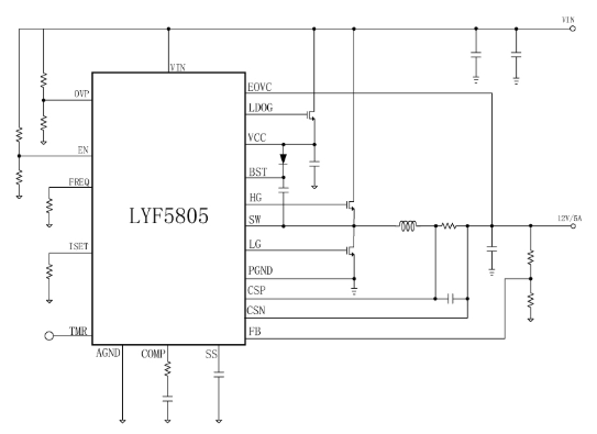產(chǎn)片介紹:LYF5805是一款100V高壓大電流同步降壓控制器,專為輸入電壓高達(dá)100V的高性能同步降壓DC DC應(yīng)用而設(shè)計(jì)。LYF5805驅(qū)動(dòng)一對(duì)外部NMOSFET。開(kāi)關(guān)頻率可在50kHz-500kHz范圍內(nèi)編程,從而可以靈活地調(diào)整效率和尺寸。對(duì)于低電壓應(yīng)用,可以使用內(nèi)部1 2V參考電壓來(lái)精確調(diào)節(jié)輸出電壓。