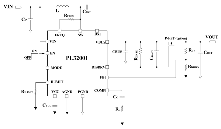 PL32001采用自適應(yīng)恒定關(guān)斷時間峰值電流模式控制。它具備一項有助于提高輕載效率的內(nèi)部特性。當(dāng)輸出電流較低時,PL32001將進入不連續(xù)導(dǎo)通模式(DCM)。PL32001的可配置特性包括可編程逐周期電流限制、可編程開關(guān)頻率功能以及模式選擇功能。