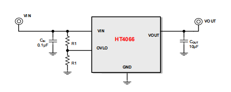 當(dāng)OVLO接地時(shí),HT4066自動(dòng)設(shè)置為固定的 5.85V過壓保護(hù)值。OVLO外接分壓電阻時(shí),可設(shè)置4~10V的過壓保護(hù)值。