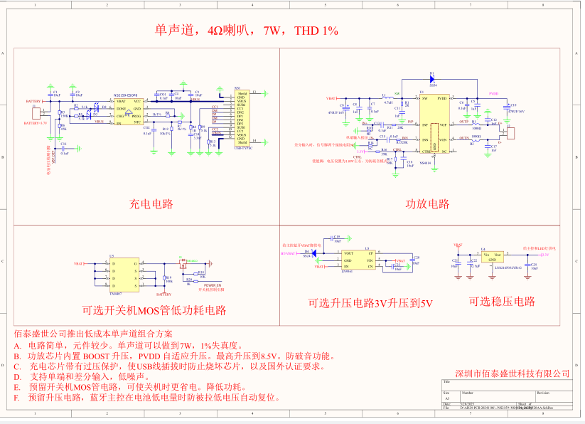 產(chǎn)片介紹:方案功能:?jiǎn)喂?jié)鋰電池(配置NS2159充電芯片,1A充電電流)模擬功放芯片(配置NS4814內(nèi)置升壓芯片,供電3V-5 5V,單聲道,最高功率10W)參數(shù)設(shè)定:3 7V電池升壓到8 5V給功放供電,使用4歐姆的喇叭,設(shè)置為7W功率,1%的失真度。應(yīng)用場(chǎng)景