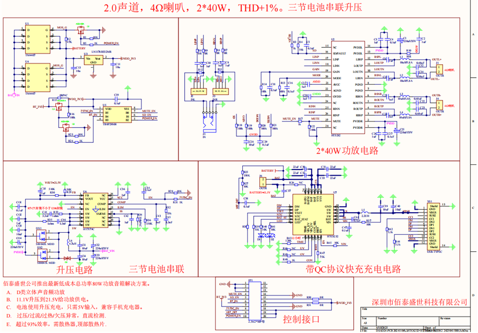 產(chǎn)片介紹:佰泰盛世公司推出最新低成本總功率80W功放音箱解決方案: A、D類立體聲音頻功放 B、11 1V升壓到21 5V給功放供電 C、電池使用升壓充電,只需sv輸入,兼容手機充電器: D、過壓 過流過熱 欠壓異常,直流檢測