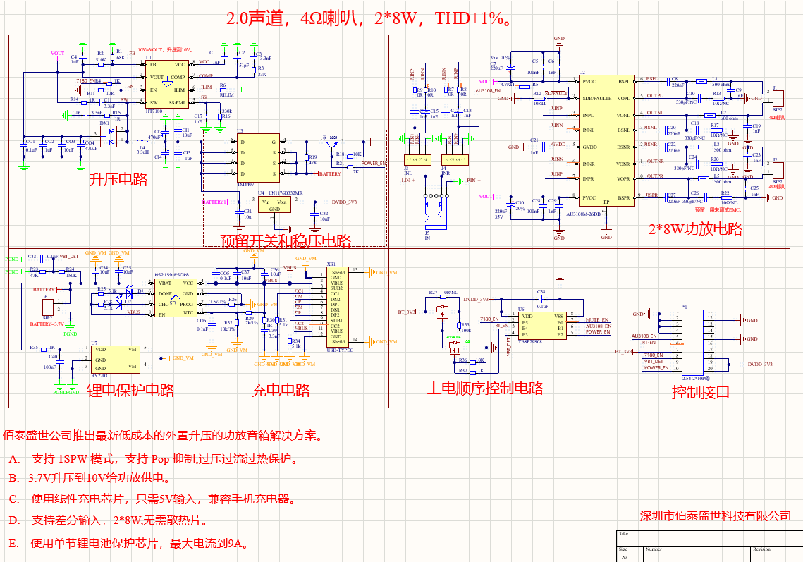"充電芯片 + 升壓芯片 + 功放芯片" 分立架構(gòu),打造 2×8W@4Ω 高保真輸出THD1% 失真率方案。