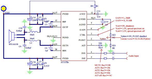 HT337B具有防削頂失真(ACF)輸出控制功能,可檢測(cè)并抑制由于輸入音樂(lè)、語(yǔ)音信號(hào)幅度過(guò)大所引起的輸出信號(hào)削頂失真(破音),也能自適應(yīng)地防止在電源電壓下降所造成的輸出削頂,顯著提高音質(zhì),創(chuàng)造非常舒適的聽(tīng)音享受,并保護(hù)揚(yáng)聲器免受過(guò)載損壞。
