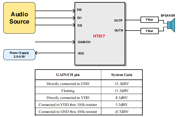 HT517集成的D類音頻功放還具有增益可調(diào)、擴(kuò)頻等功能。