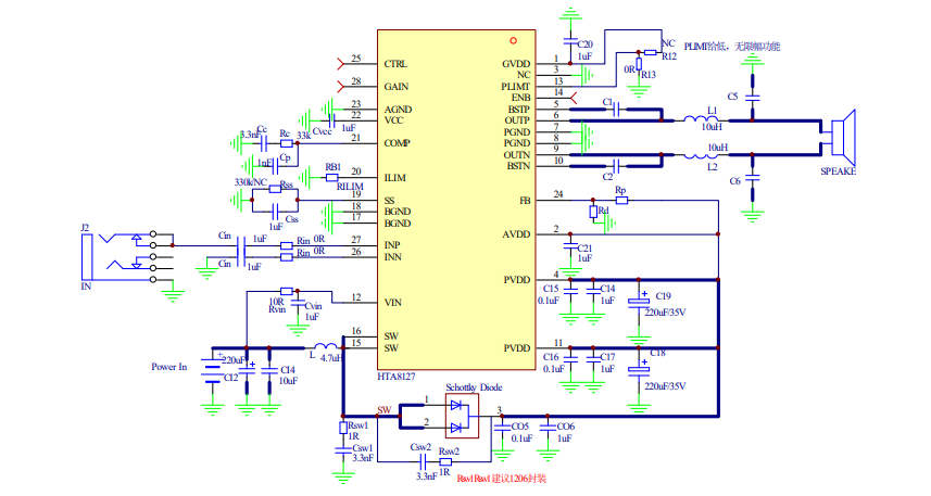 此外,HTA8127內(nèi)部集成免濾波器調(diào)制技術(shù),能夠直接驅(qū)動揚聲器,內(nèi)置的關(guān)斷功能使待機(jī)電流最小化,還集成了輸出端過流保護(hù)、片內(nèi)過溫保護(hù)、輸入電源欠壓異常保護(hù)、升壓電壓過壓保護(hù)等功能。
